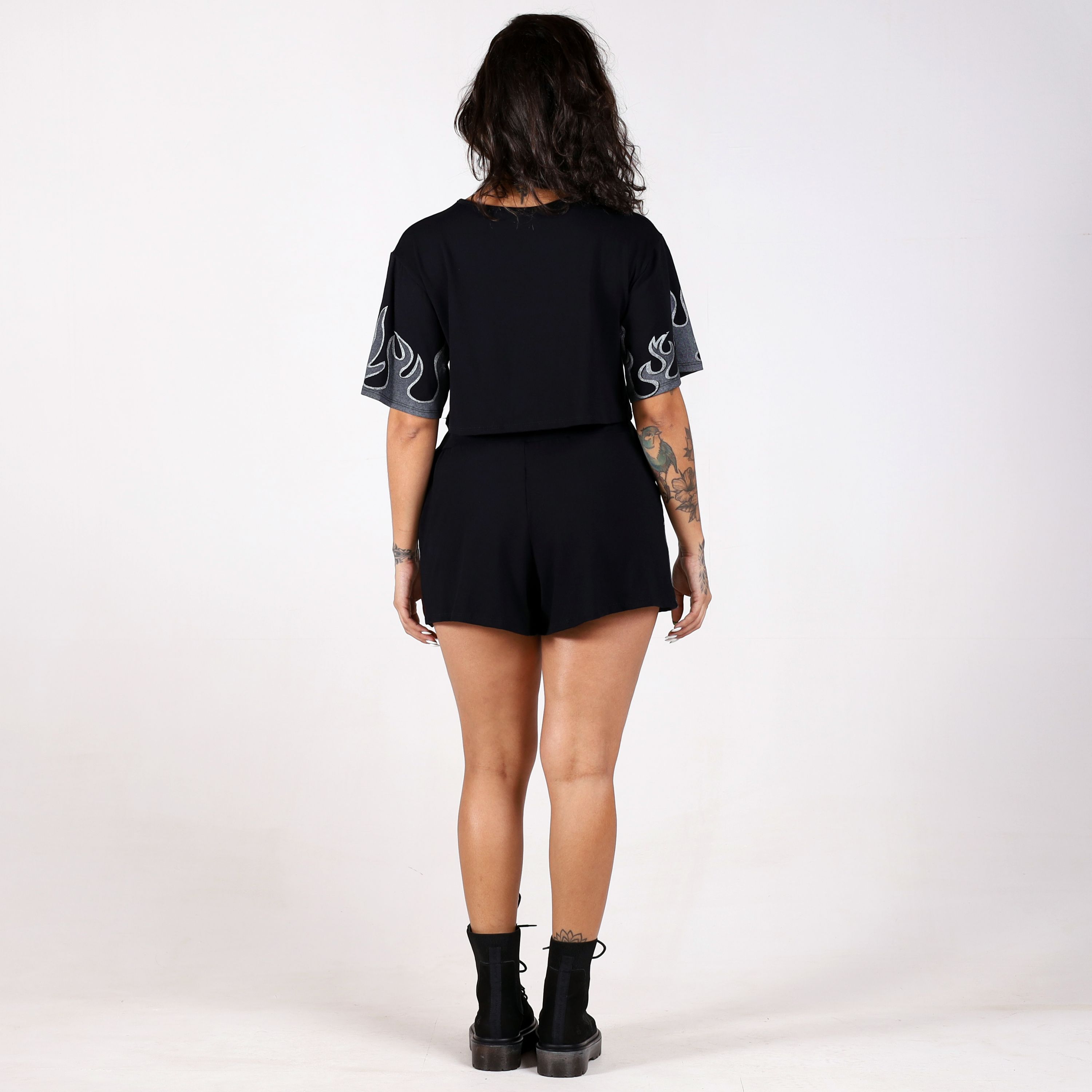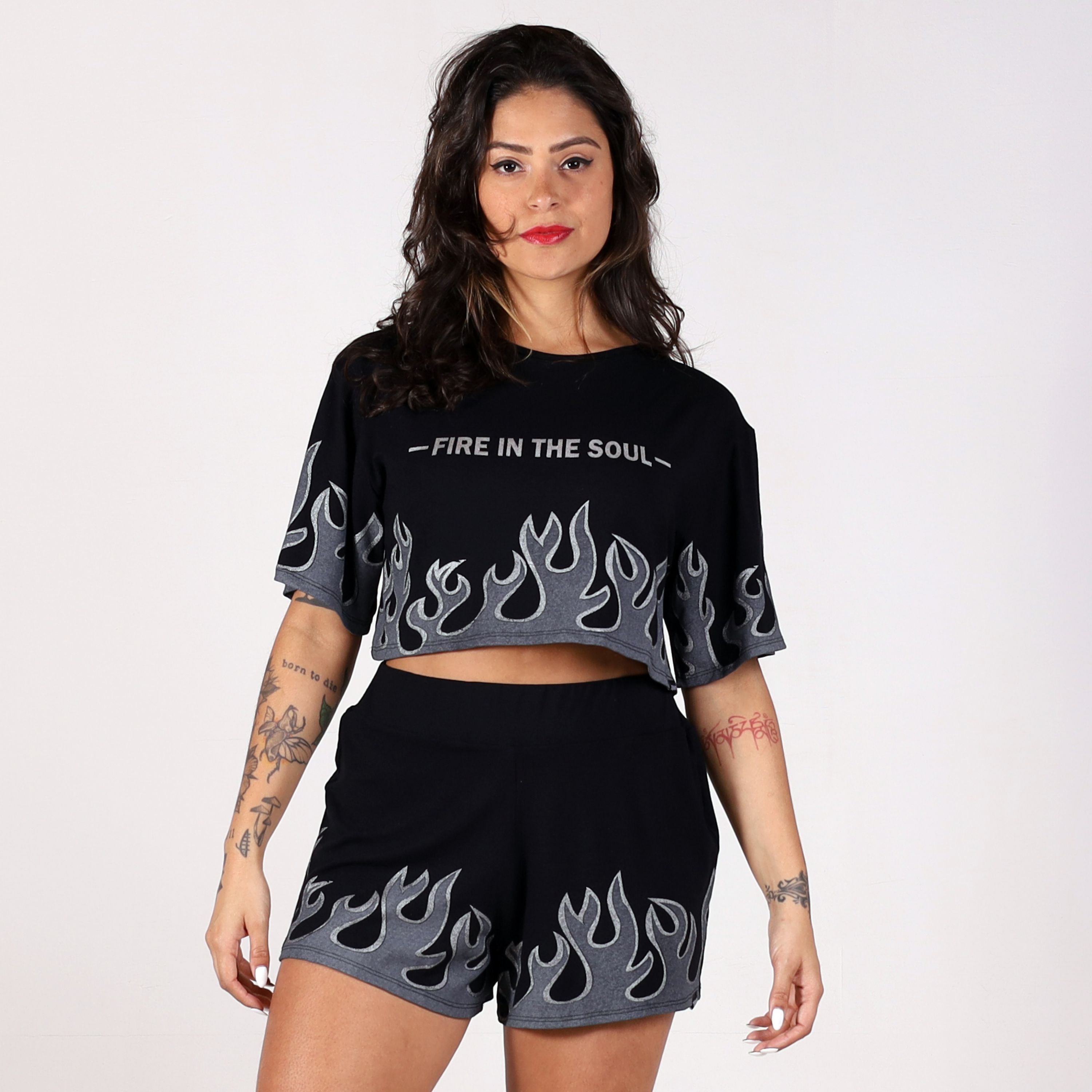 O Conjunto Fire foi confeccionado em tecido de viscose com elastano na cor preta. O Conjunto é composto por duas peças. Possui comprimento cropped e estampa de chamas na barra da blusa e do short. É casual e moderno, ideal para momentos descontraídos sem perder o estilo.