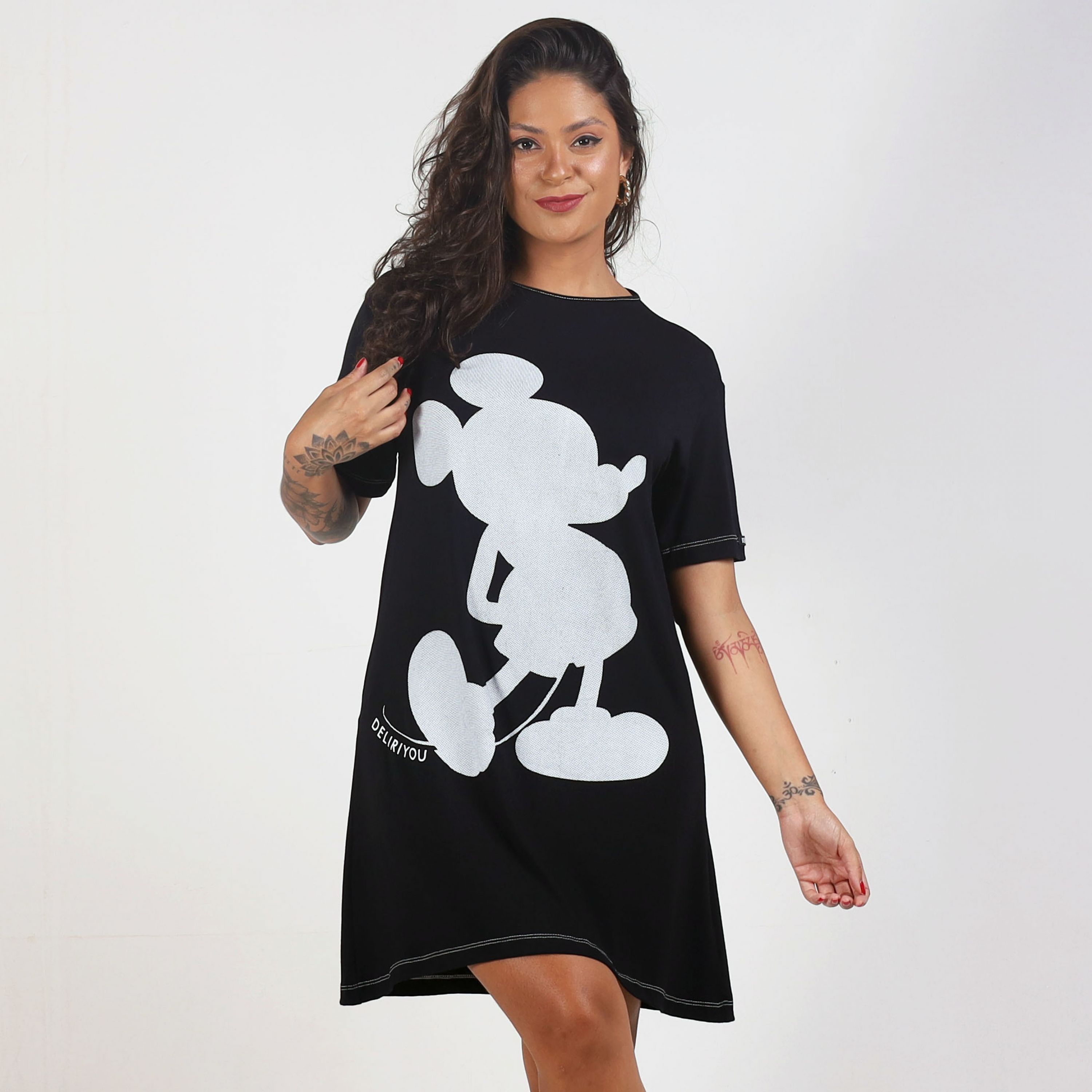 O VESTIDO T-SHIRT MICKEY DELIRIYOU é feito em viscolycra preta, oferecendo um caimento perfeito e muito conforto. Com gola redonda e modelagem t-shirt, essa peça é prática e estilosa, ideal para o dia a dia. A estampa da silhueta do Mickey, com detalhe de pontilhado branco na costura, traz um toque moderno e descolado, deixando o visual mais divertido e único. Perfeito para quem ama um estilo casual com personalidade!