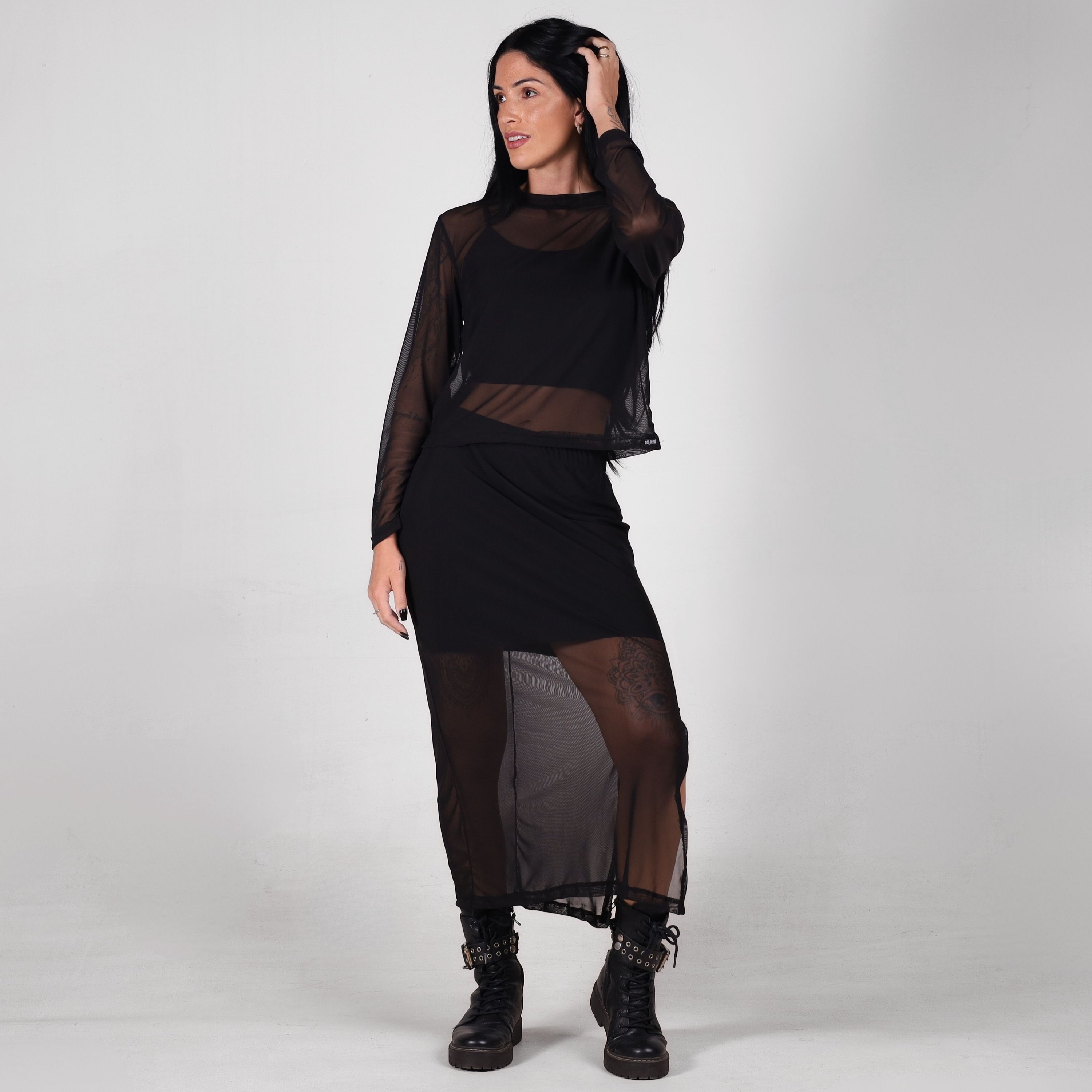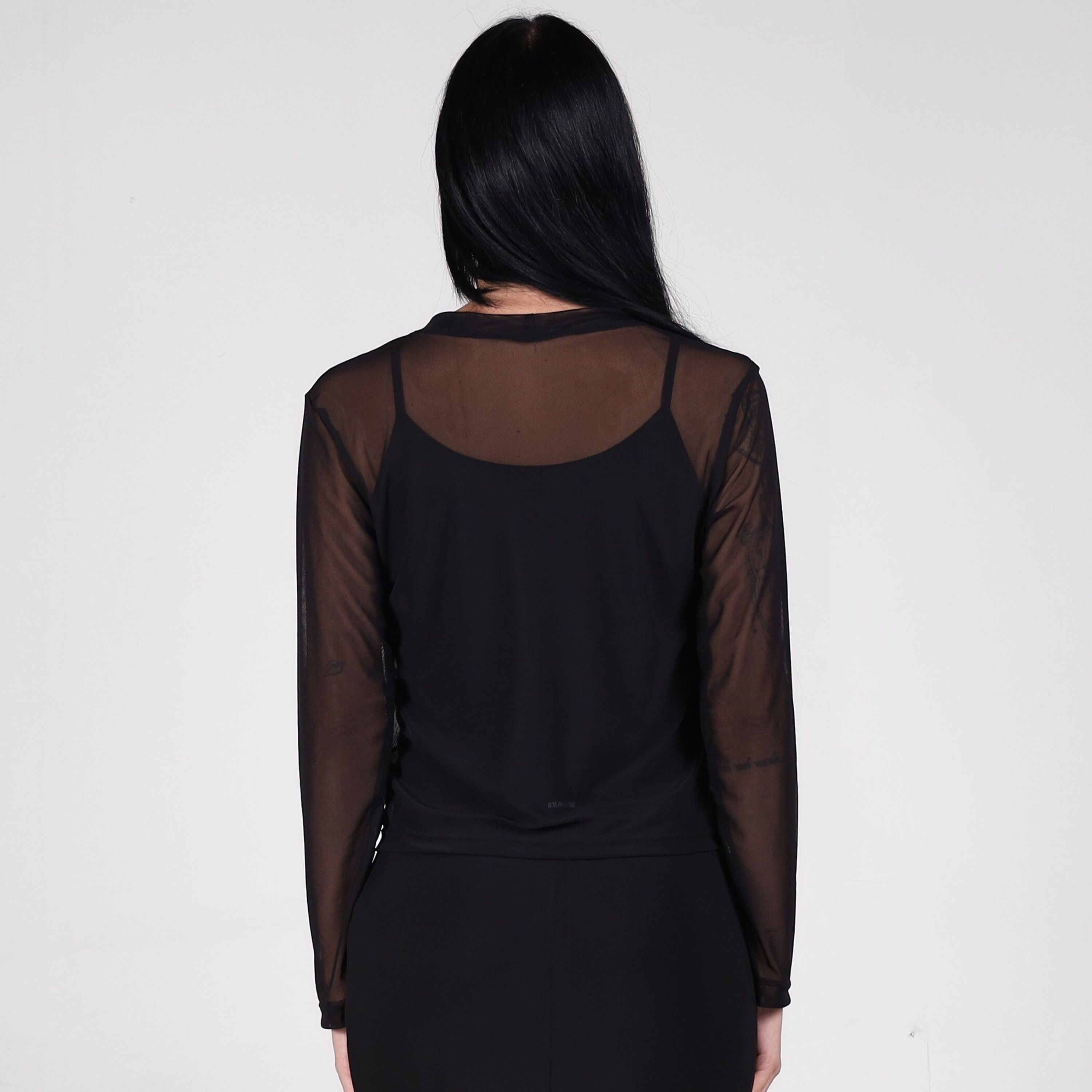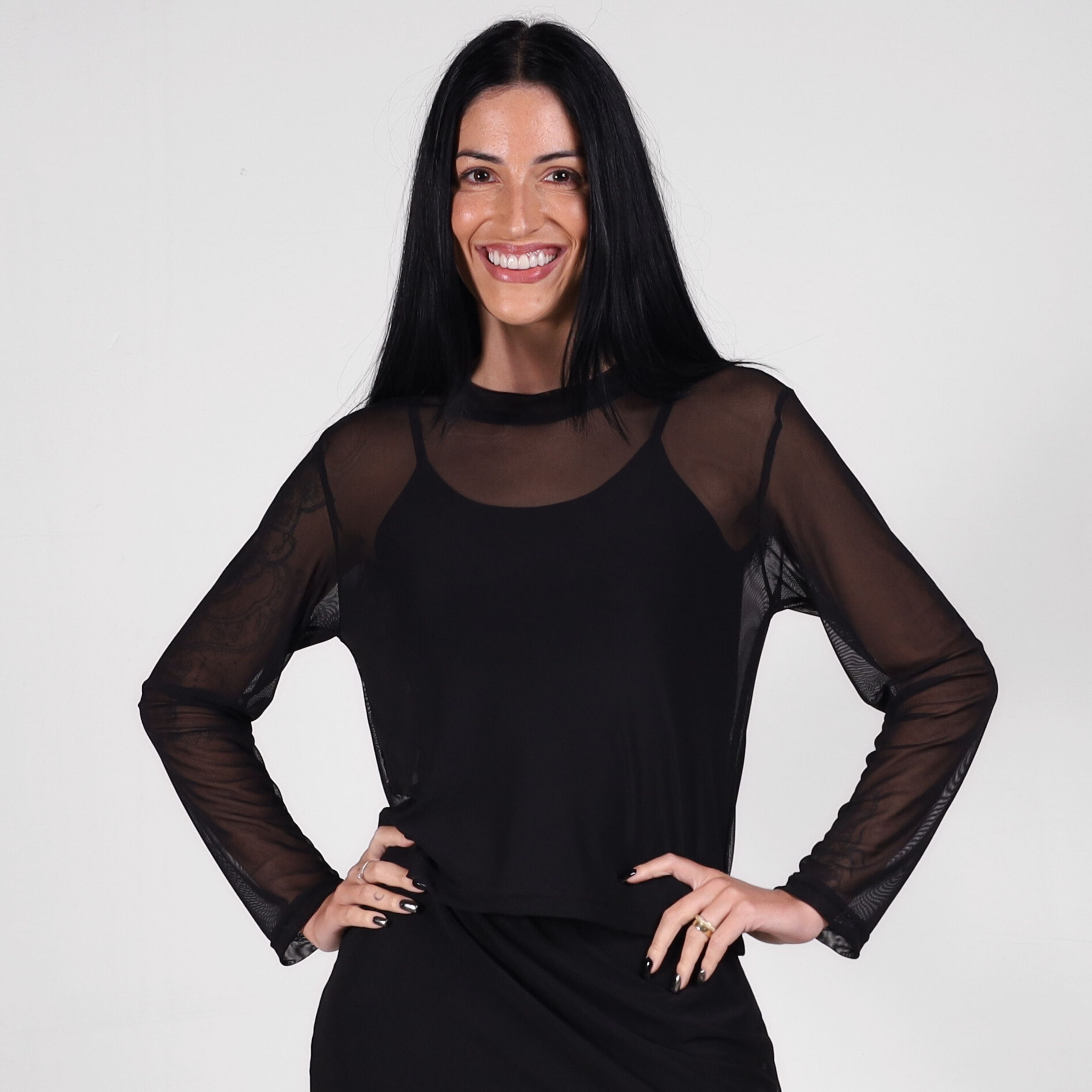 Confeccionada em tule preto leve e sofisticado, a peça acompanha uma blusinha de alça por baixo, garantindo praticidade e conforto sem abrir mão do estilo. As mangas longas ajustadas trazem modernidade e permitem criar produções versáteis, do casual ao fashionista.