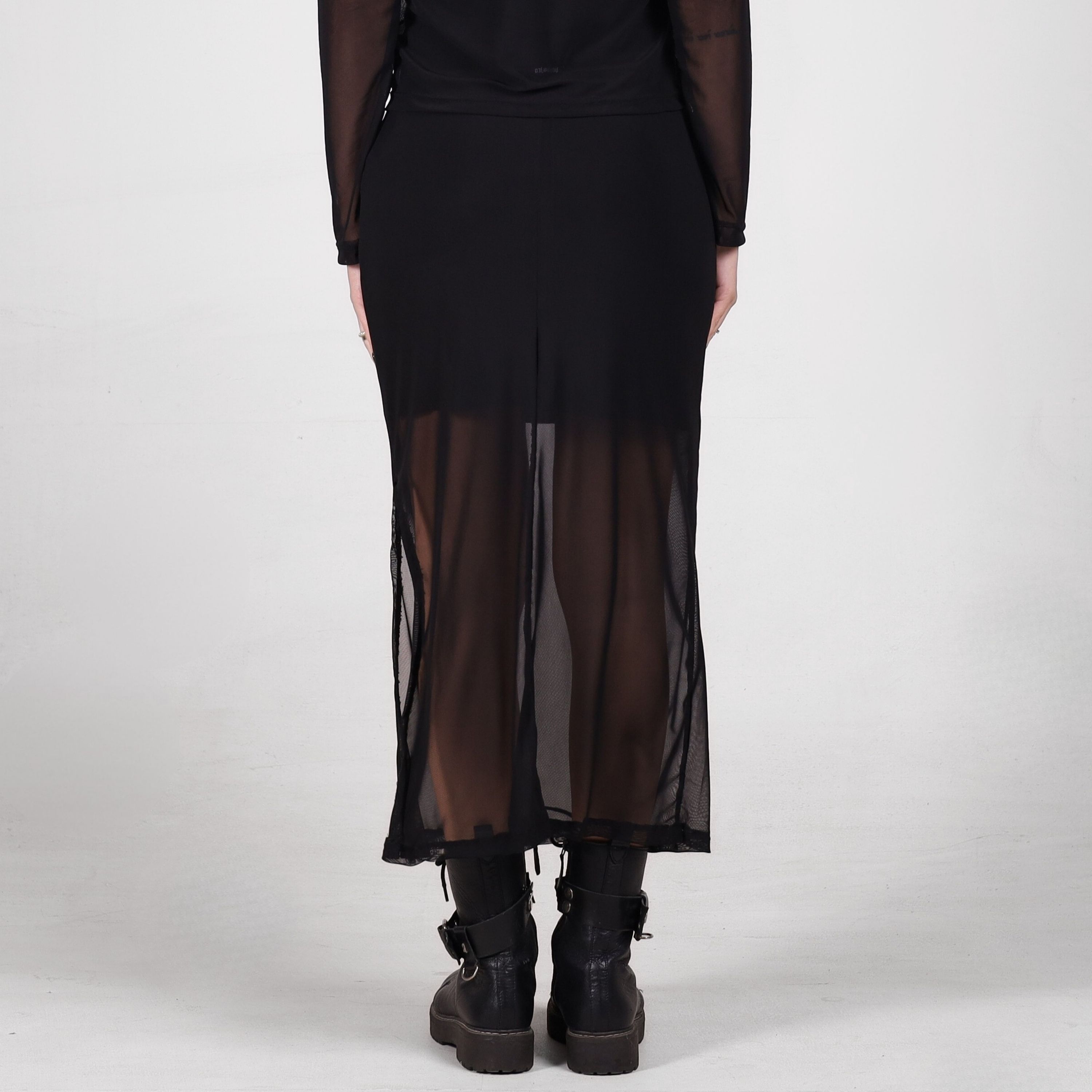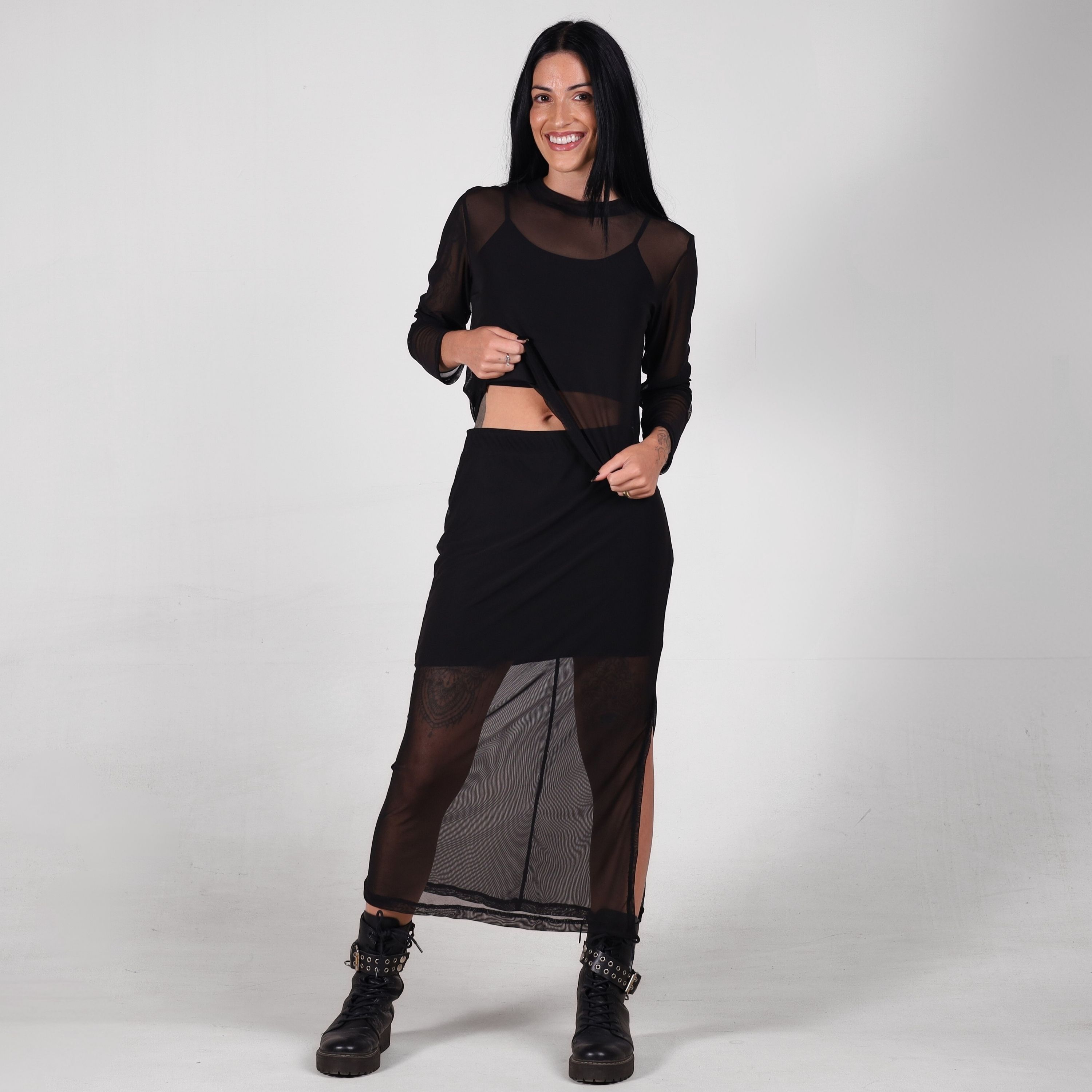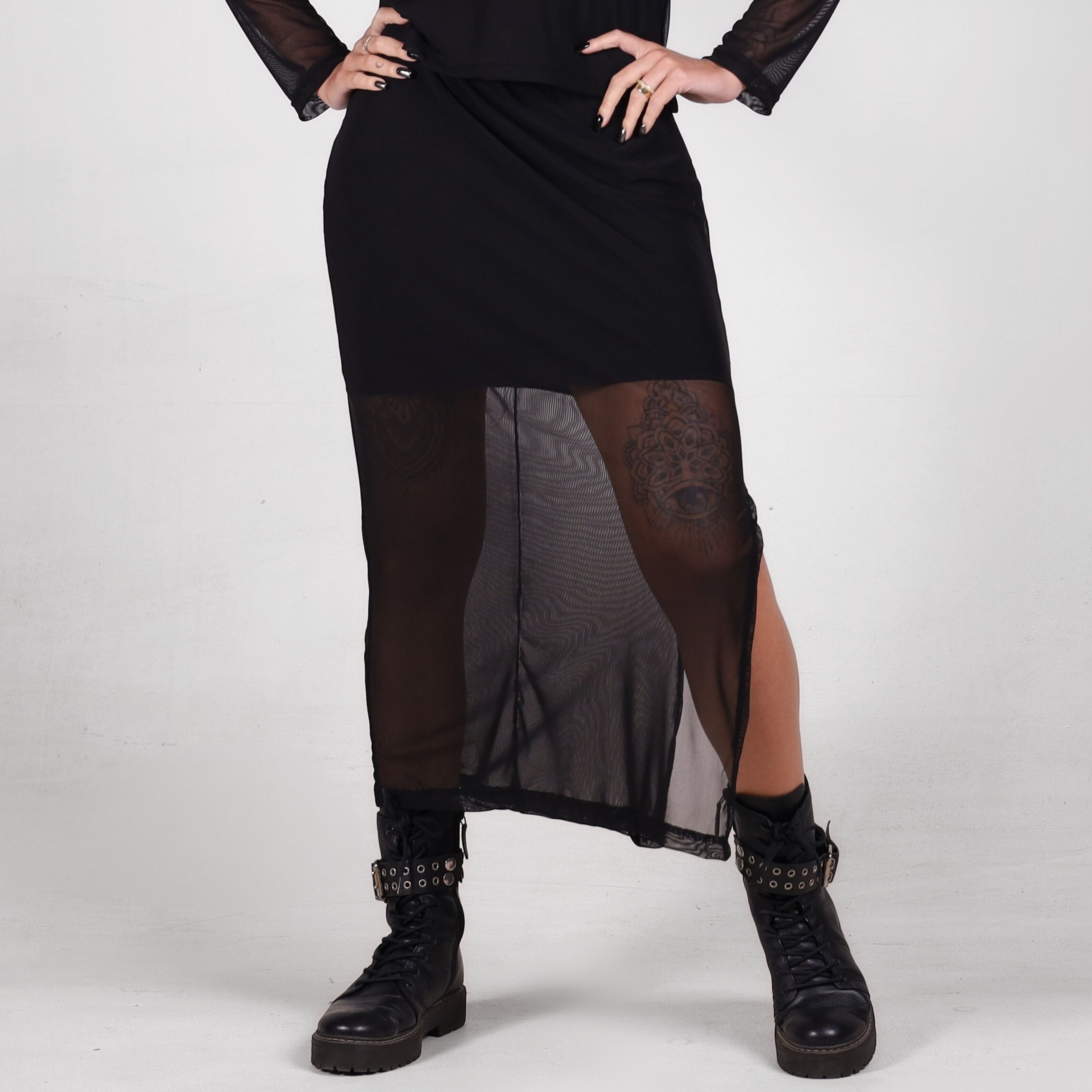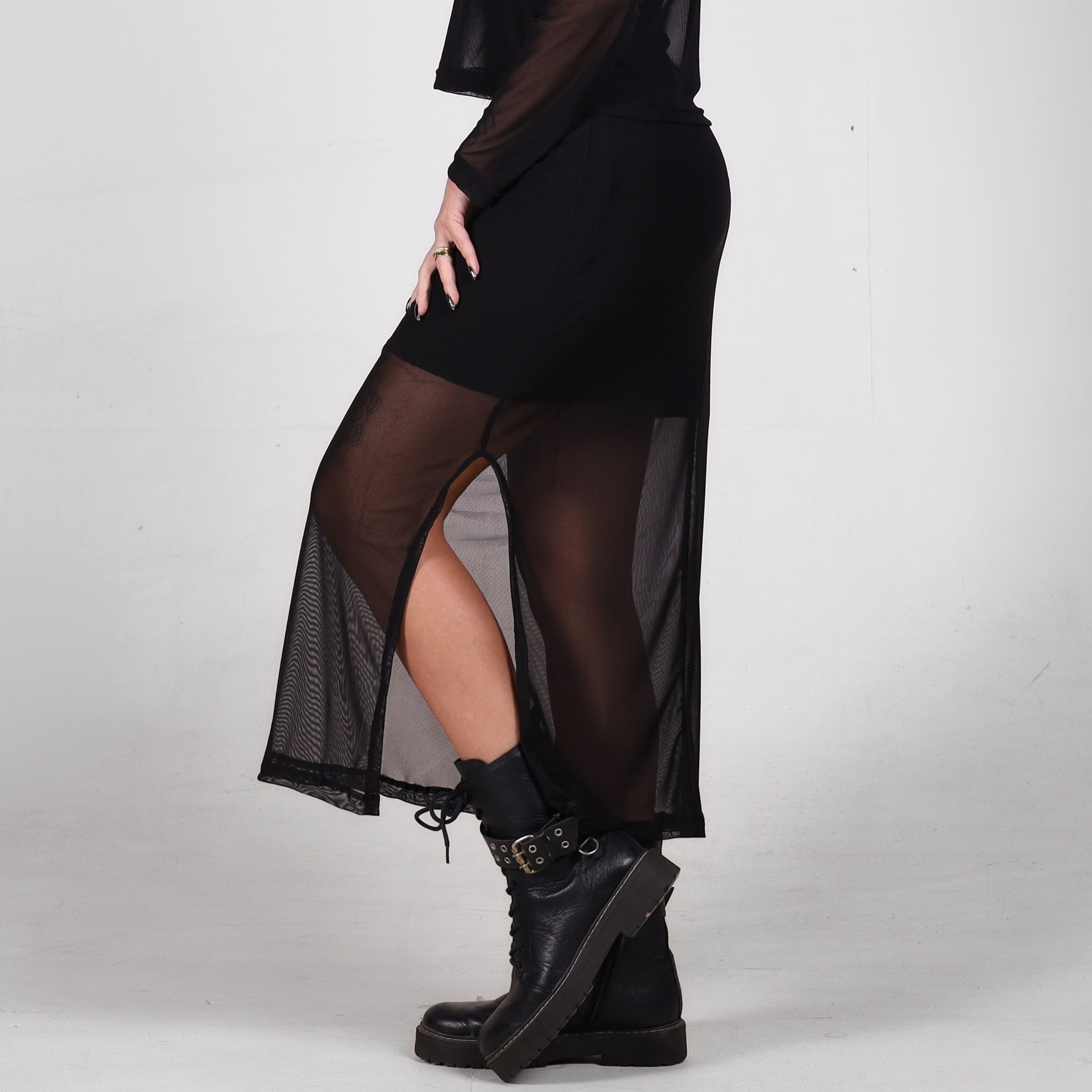 Confeccionada em tule preto leve e fluido, a peça traz transparência sutil e movimento sofisticado. A fenda lateral adiciona sensualidade e modernidade, garantindo um visual impactante e cheio de atitude.