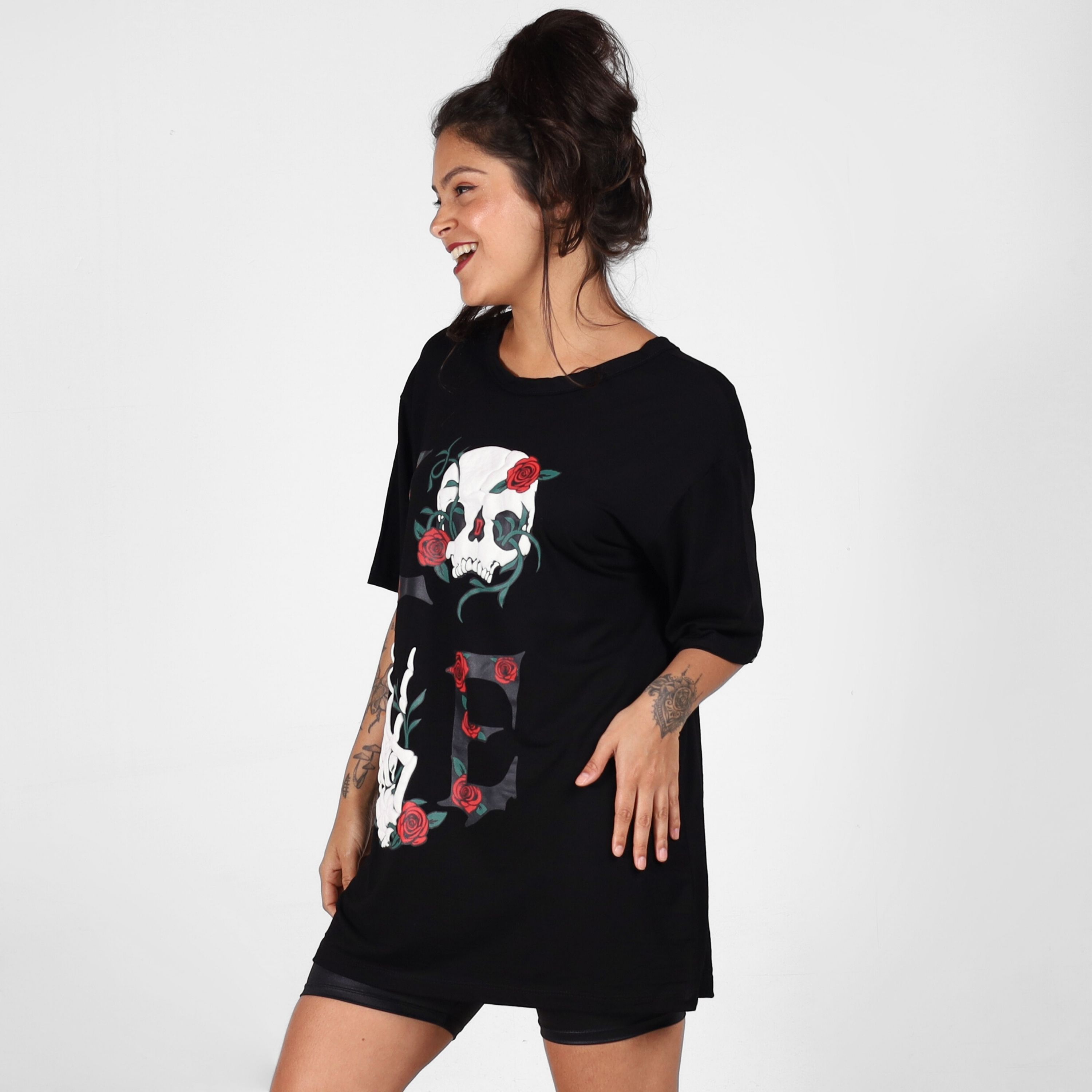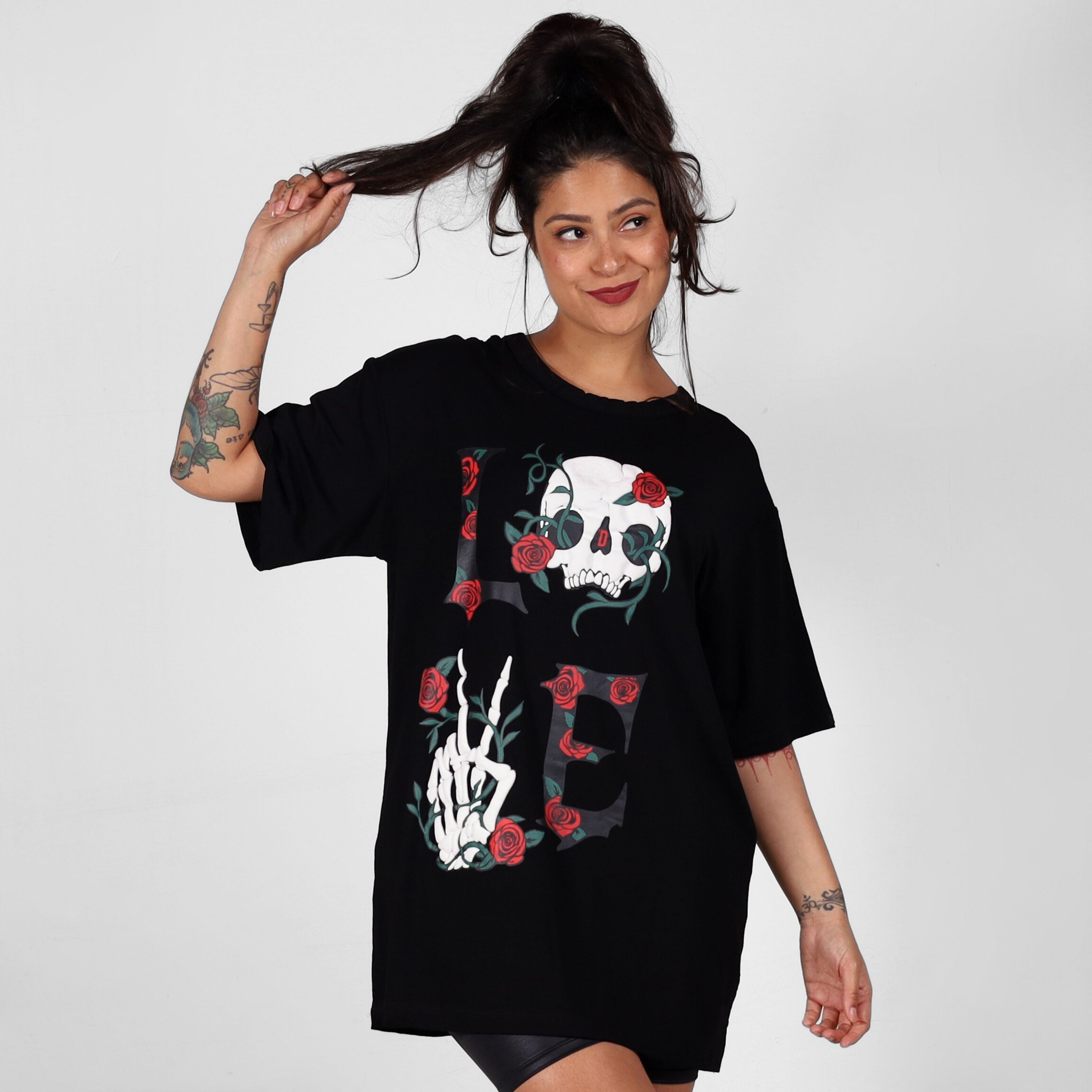 A Blusa Love & Bones traduz a união entre o lado romântico e o dark em uma única peça. Sua estampa em puff 3D destaca caveira, ossos e rosas vermelhas compondo a palavra LOVE com atitude e originalidade. Confeccionada em malha preta confortável, é a escolha ideal para quem busca estilo alternativo e urbano sem abrir mão do conforto.