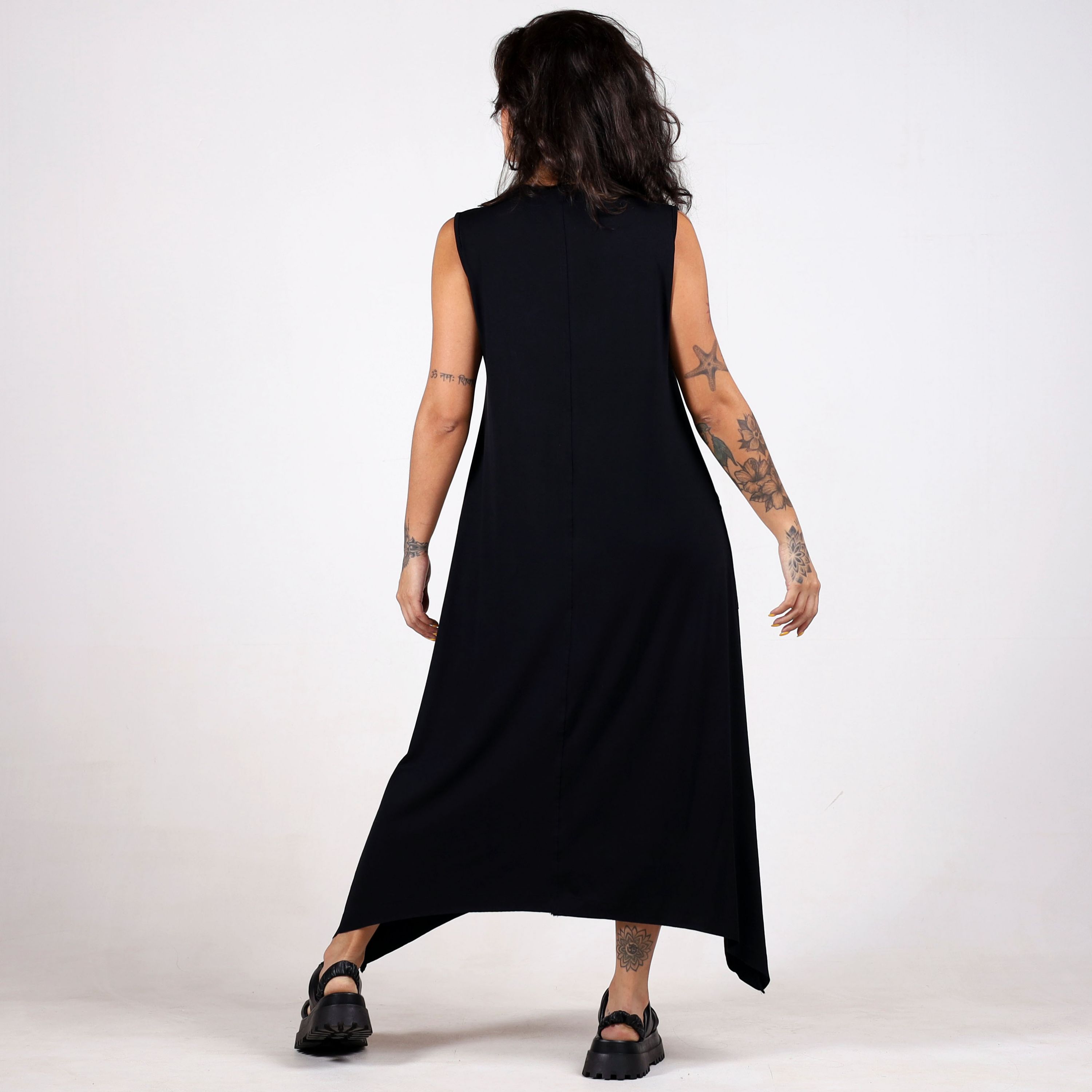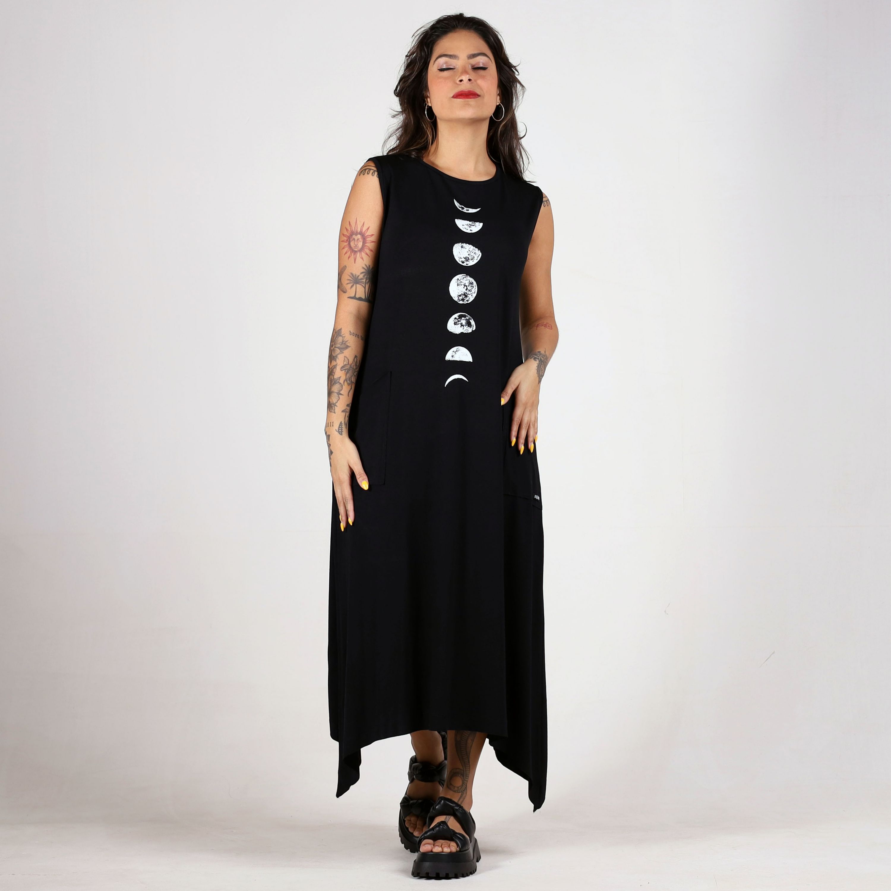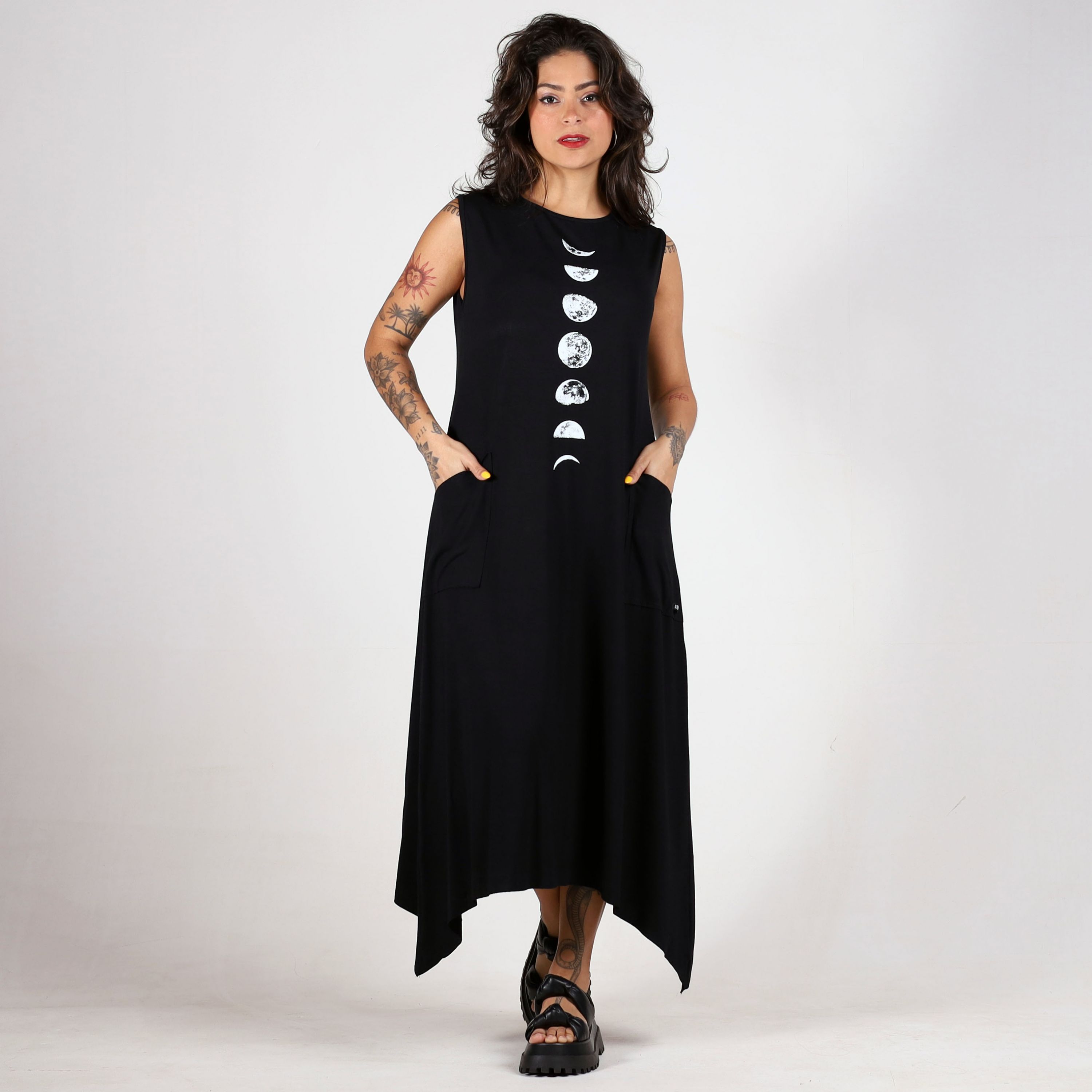 O VESTIDO FASES DA LUA foi confeccionado em viscolycra preta, garantindo conforto e caimento perfeito. Com dois bolsos expostos frontais, ele oferece praticidade e estilo. A estampa na cor branca, representando as fases da lua, traz um toque místico e moderno à peça. Sua modelagem midi assimétrica com dois bicos laterais confere um visual único e elegante, ideal para ocasiões descontraídas ou especiais.