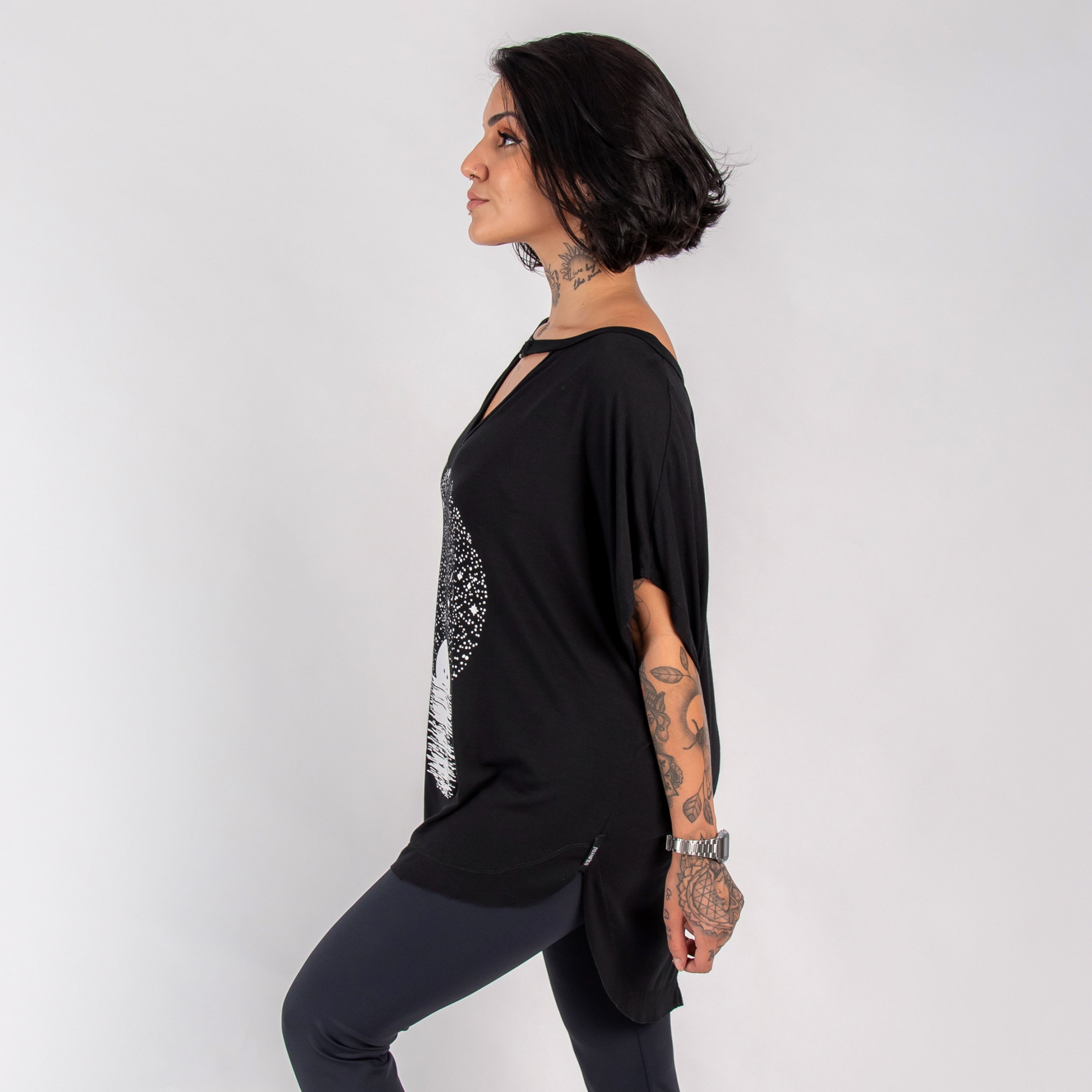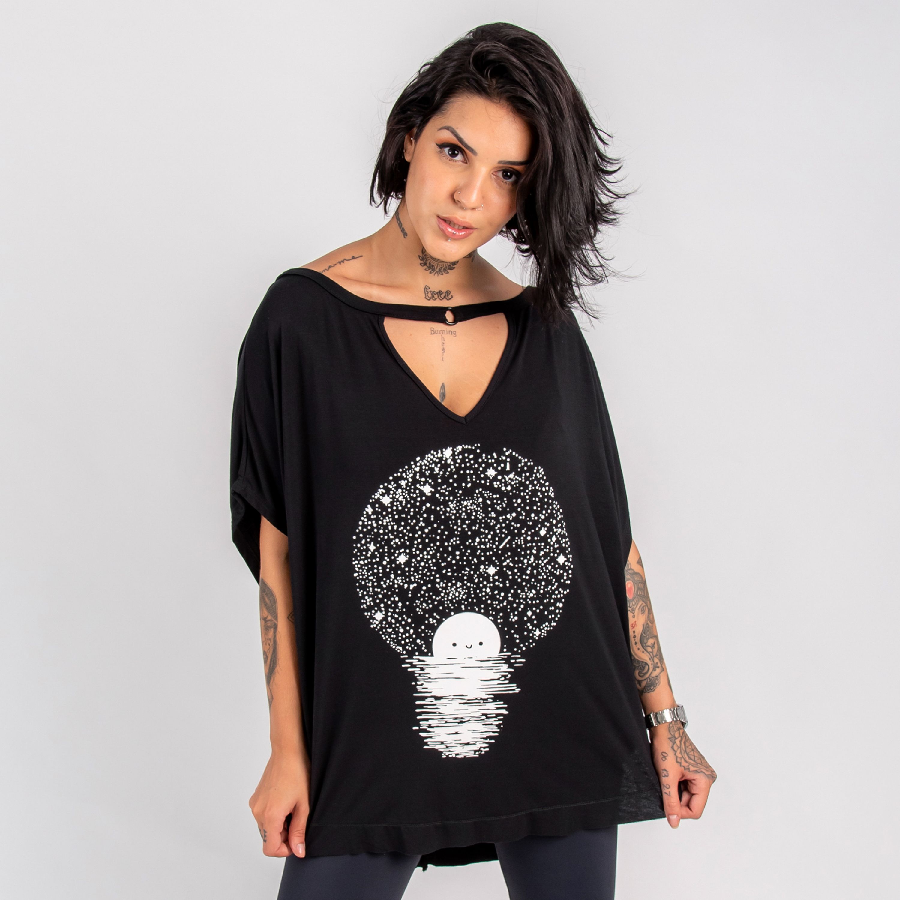 A BLUSA LIGHT MOON foi confeccionada em tecido de viscolycra, oferecendo leveza e conforto. Possui uma estampa de lua se pondo refletindo no mar, na cor branca, que adiciona um toque de delicadeza e inspiração. O detalhe choker de argolinha preta na frente dá um ar moderno e diferenciado à peça. Com modelagem canoa mullet, é uma max blusa estilosa e versátil, perfeita para compor looks incríveis para qualquer ocasião.